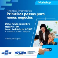 A Prefeitura de Tapejara, em parceria com o Sebrae, promove na quinta-feira (13), o Workshop Finanças Empresariais: Primeiros Passos para Novos Negócios. O encontro tem início às 19h, no Auditório da ACISAT (Rua Comércio, nº 987), e tem como objetivo auxiliar quem deseja iniciar um empreendimento ou aprimorar a gestão financeira de pequenos negócios.
