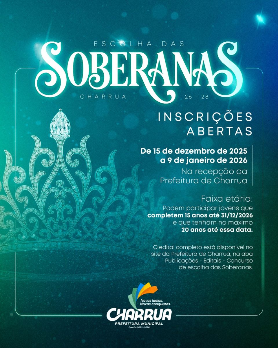 As candidatas interessadas devem comparecer à recepção da Prefeitura Municipal para efetivar a inscrição. O concurso busca jovens que tenham entre 15 e 20 anos (completos até 31/12/2026) para representar a beleza e a cultura charruense nos próximos eventos oficiais.