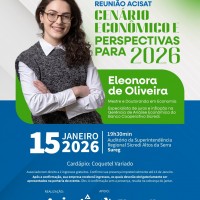 A Associação Comercial, Industrial, de Serviços e Agronegócio de Tapejara (Acisat) realiza, no dia 15 de janeiro, uma reunião com foco no cenário econômico e nas perspectivas para 2026. O evento terá como palestrante Eleonora de Oliveira, mestre e doutoranda em economia, especialista em juros e inflação na gerência de análise econômica do Banco Cooperativo Sicredi.