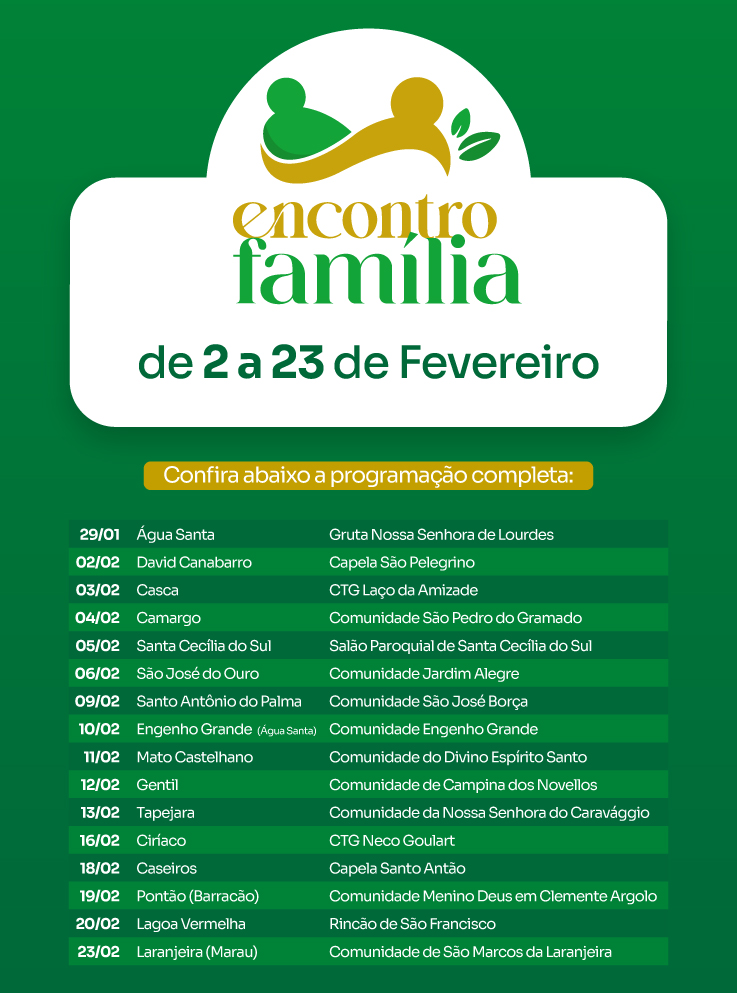 Ainda nesta semana, os encontros serão realizados em Casca, na terça (03), no CTG Laço da Amizade; em Camargo, na quarta (04), na Comunidade São Pedro do Gramado; em Santa Cecília do Sul, na quinta (05), no Salão Paroquial; e em São José do Ouro, na sexta (06), na Comunidade Jardim Alegre, mantendo a mesma palestrante e temática ao longo destes dias.