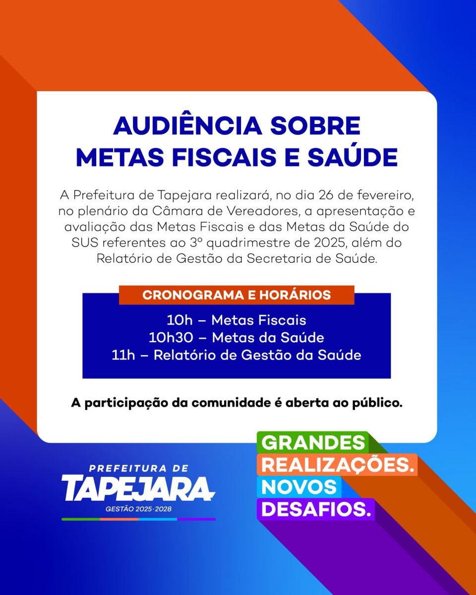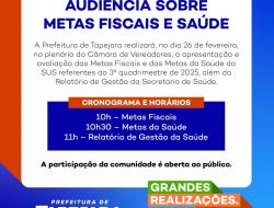 A Prefeitura de Tapejara realiza, na quarta-feira (26), uma audiência pública para a apresentação e avaliação das metas fiscais e da saúde referentes ao terceiro quadrimestre de 2025. O encontro ocorre no plenário da Câmara de Vereadores e é aberto à participação da comunidade.